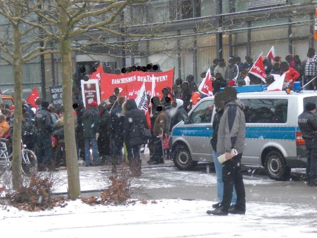 Als die Nazis dann eintrafen, wurden sie mit einem gellenden Pfeifkonzert empfangen. Einige junge Antifas stellten sich vor die NPD-Fahrzeuge und wollten die Anfahrt blockieren. Die Polizei machte die Straße allerdings recht ruppig wieder frei.