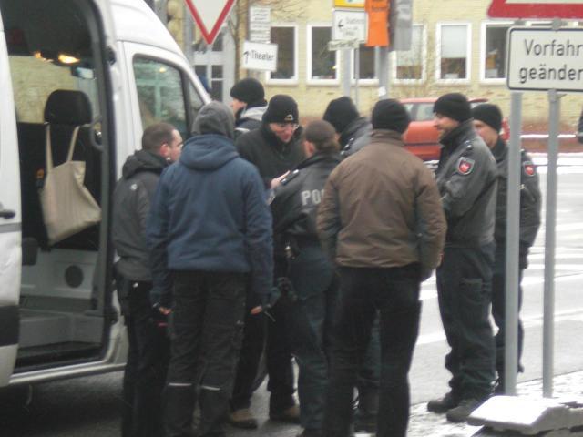 Bevor die Nazis weiter nach Wolfsburg fahren konnten, musste der Tross zunächst noch mal stoppen, da die Polizei eine Personalienfeststellung durchführen wollte. Gegen ein Nazi lag eine Anzeige wegen Beleidigung vor.