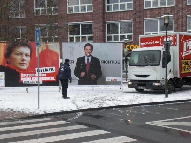 An dieser Straßenecke standen zudem noch Wahlplakate der SPD, CDU und Die Linke.Nachdem bekannt wurde, dass die NPD im Rahmen ihrer Wahltour durch Niedersachsen auch Station in Uelzen machen will, riefen unterschiedliche Organisationen zu einer Gegenveranstaltung auf. Den Aufrufen der Gewerkschaften, Jugendantifa Uelzen, der SPD und anderen folgten dann mehr als 150 Menschen.Die antifaschistische Veranstaltung fand auf der gegenüberliegenden Straßenseite des Naziversammlungsortes statt. Bevor die Nazis kurz nach 10 Uhr auftauchten, hielt eine Vertreterin der Jugendantifa Uelzen noch einen Redebeitrag, in dem auch auf die aktuellen Naziaktivitäten in Uelzen eingegangen wurde.