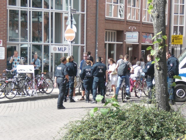 Kurze Zeit später forderte die Polizei die Gegendemonstrant_innen auf leiser zu sein, da sie gegen die Auflagen verstoßen würden. Vertreter des Ordnungsamtes überprüften dann immer wieder die Lautstärke der Lautsprecheranlage und forderte zu Regulierung der Lautstärke auf. Die Menschen am Platz beantworteten diese schikanöse Behandlung dadurch, dass noch lauter gerufen und gepfiffen wurde. Nur mit Mühe konnte sie die NPD einigermaßen verständlich machen. Rund um den Platz war so gut wie nichts von den Nazis zu hören.